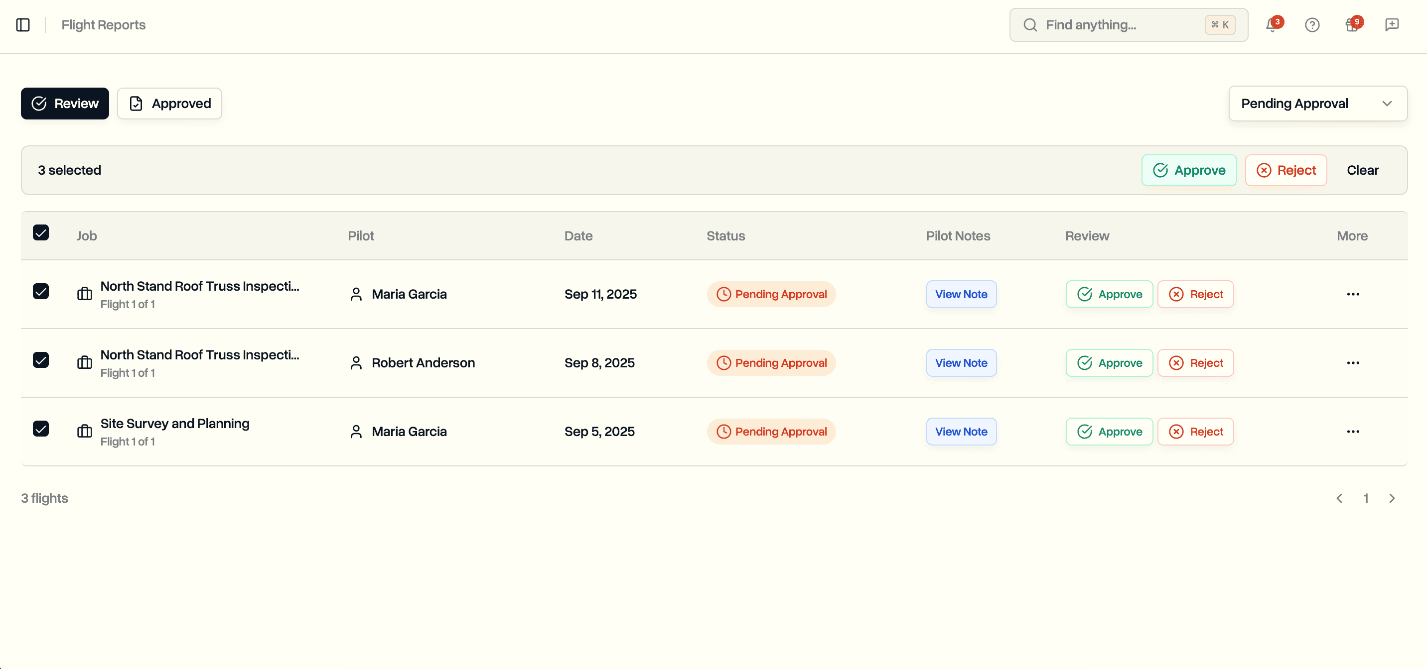 - Review tab on Flight Reports (bulk Approve and Reject)